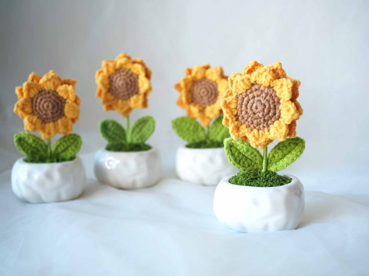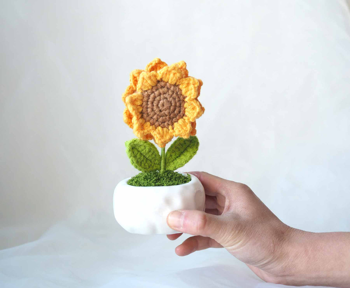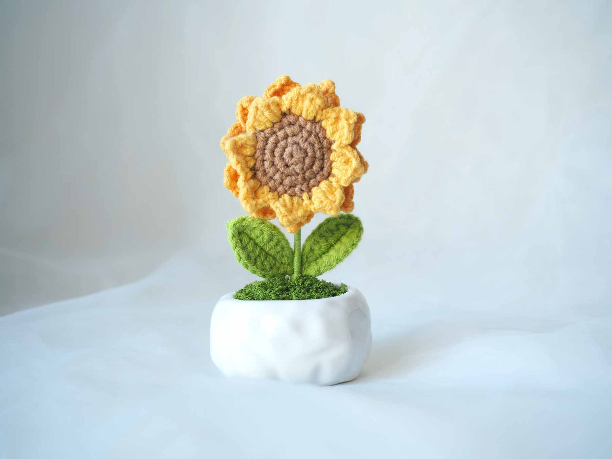 Brighten someone’s day (or your own!) with this adorable crochet sunflower in a ceramic pot. Handmade with love, this single sunflower never wilts – it’s the perfect forever bloom to add warmth and cheer to any space.