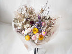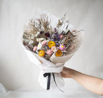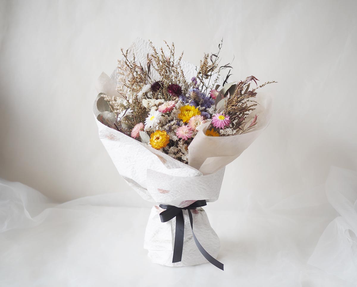 A colourful dried flower bouquet in pink, white, yellow, and purple, featuring native Australian paper daisies and strawflowers - beautiful from every angle.