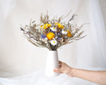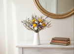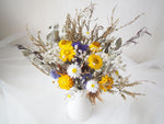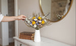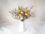 A tall, vibrant bouquet of everlasting blooms, artfully arranged in a white ceramic vase. Featuring naturally dried daisies, strawflowers, statice, thryptomene, and eucalyptus in fresh tones of yellow, white, and green.