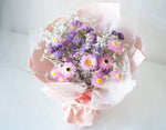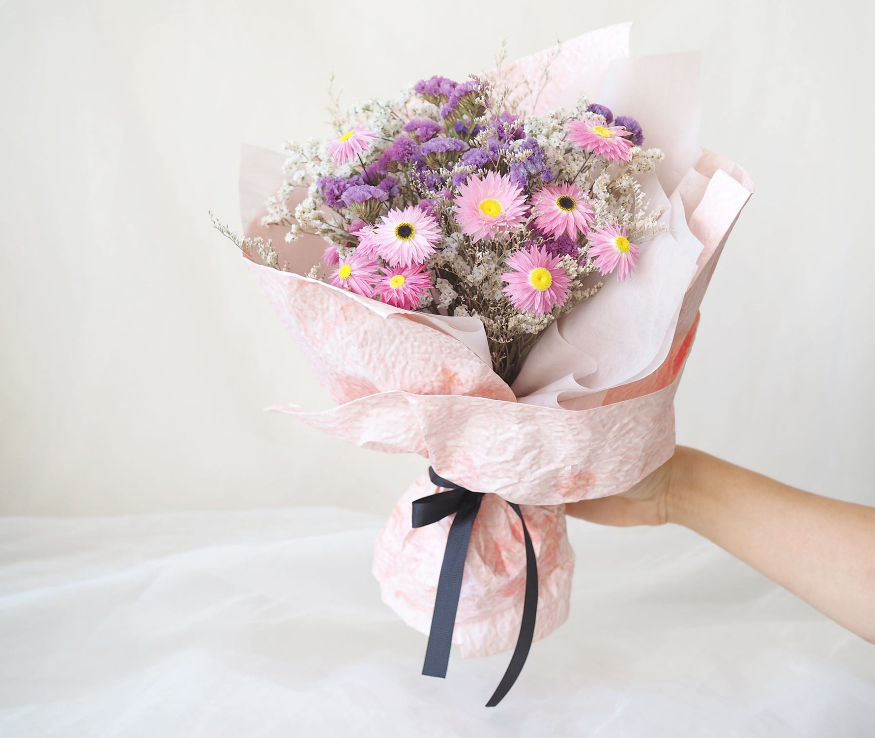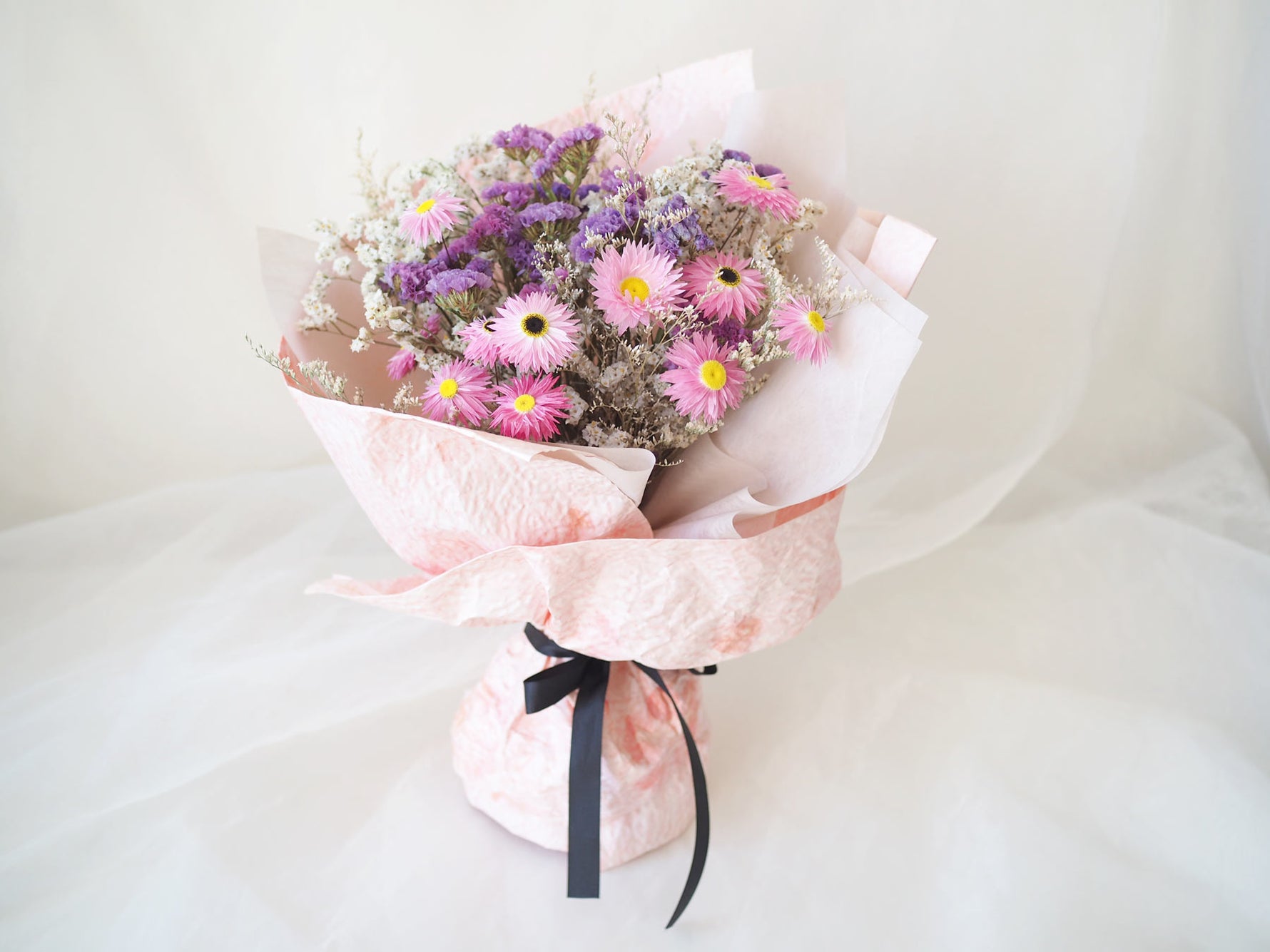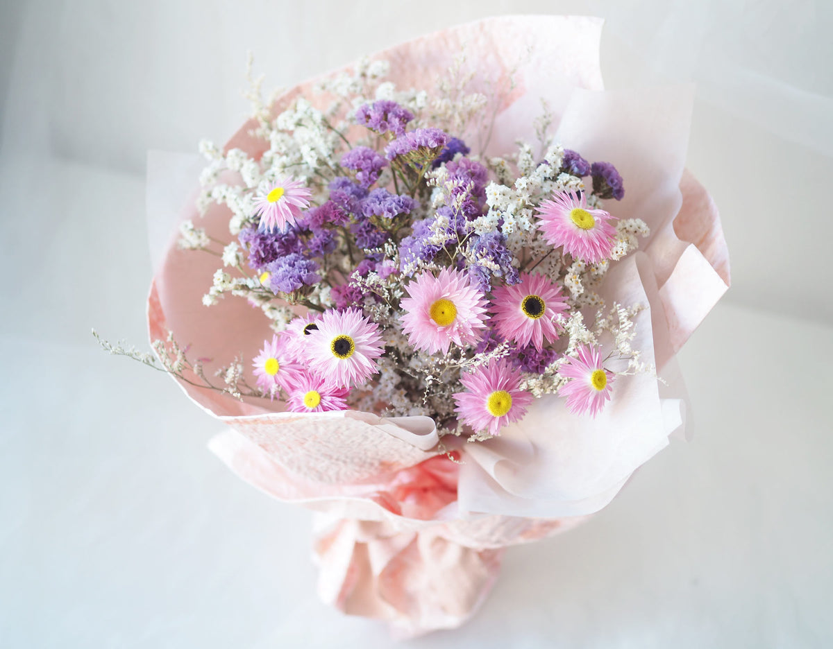 A classic 360-degree, round-shaped bouquet in pink, white, and purple, featuring native Australian paper daisies and strawflowers - beautiful from every angle.