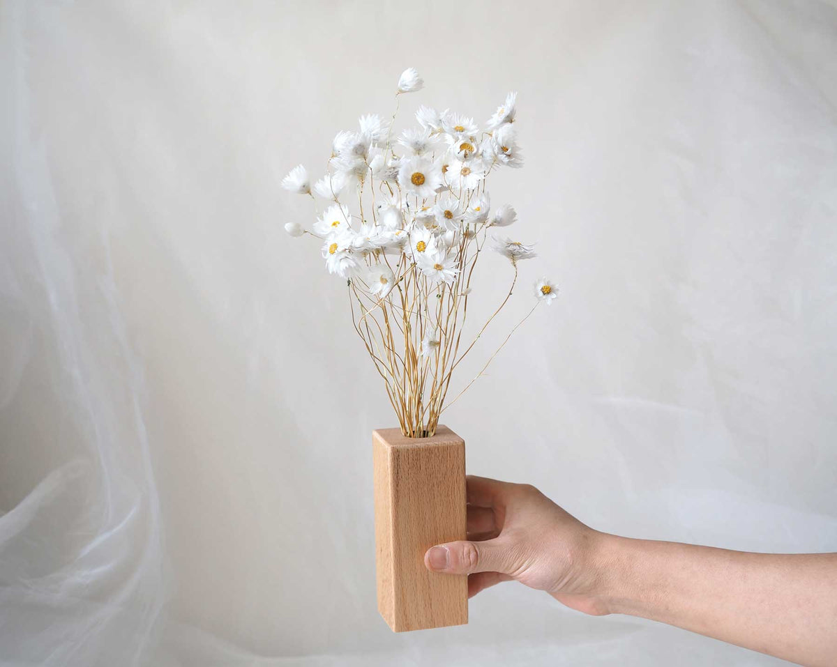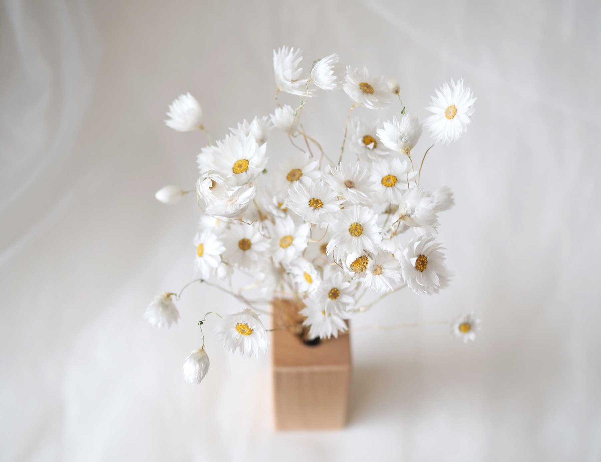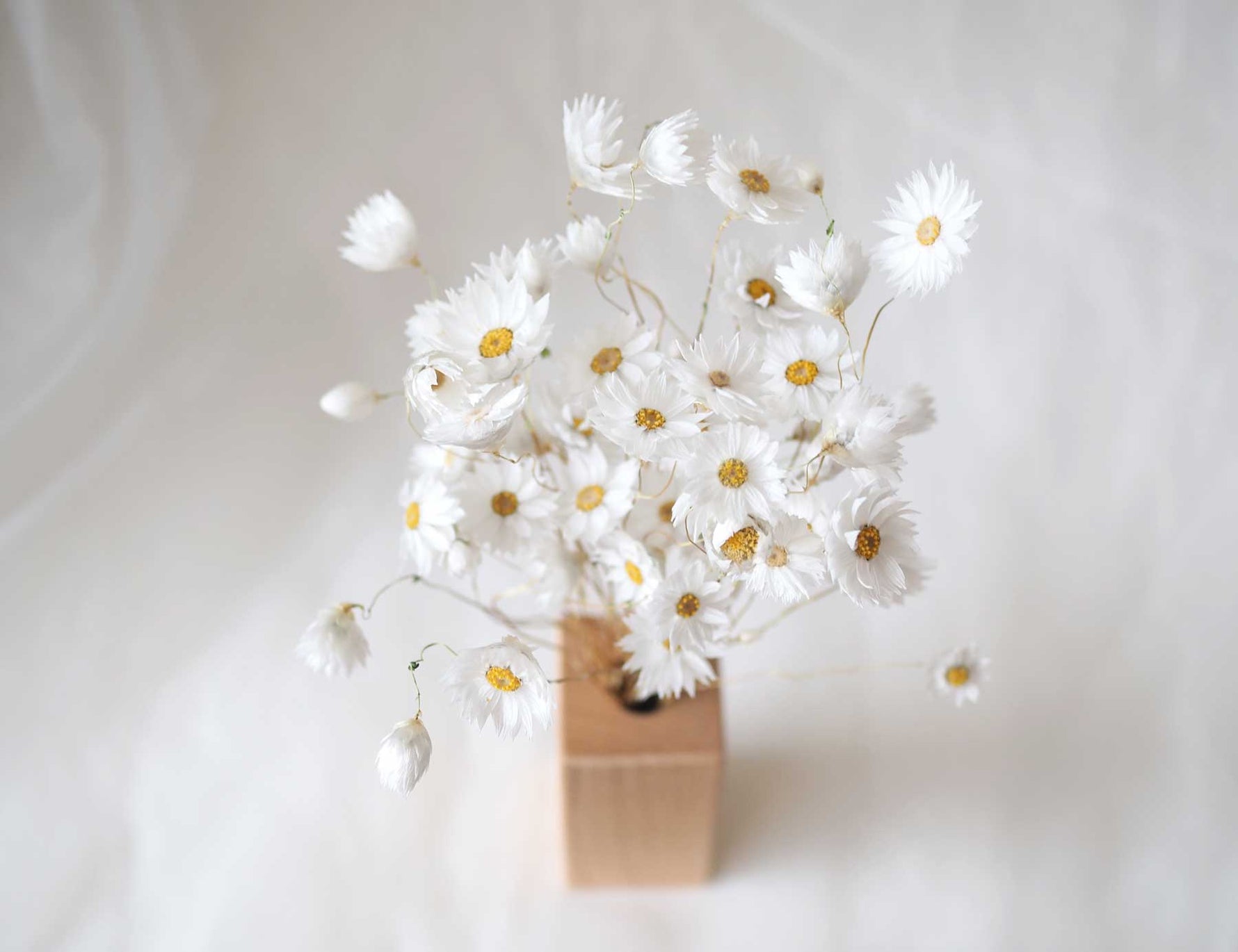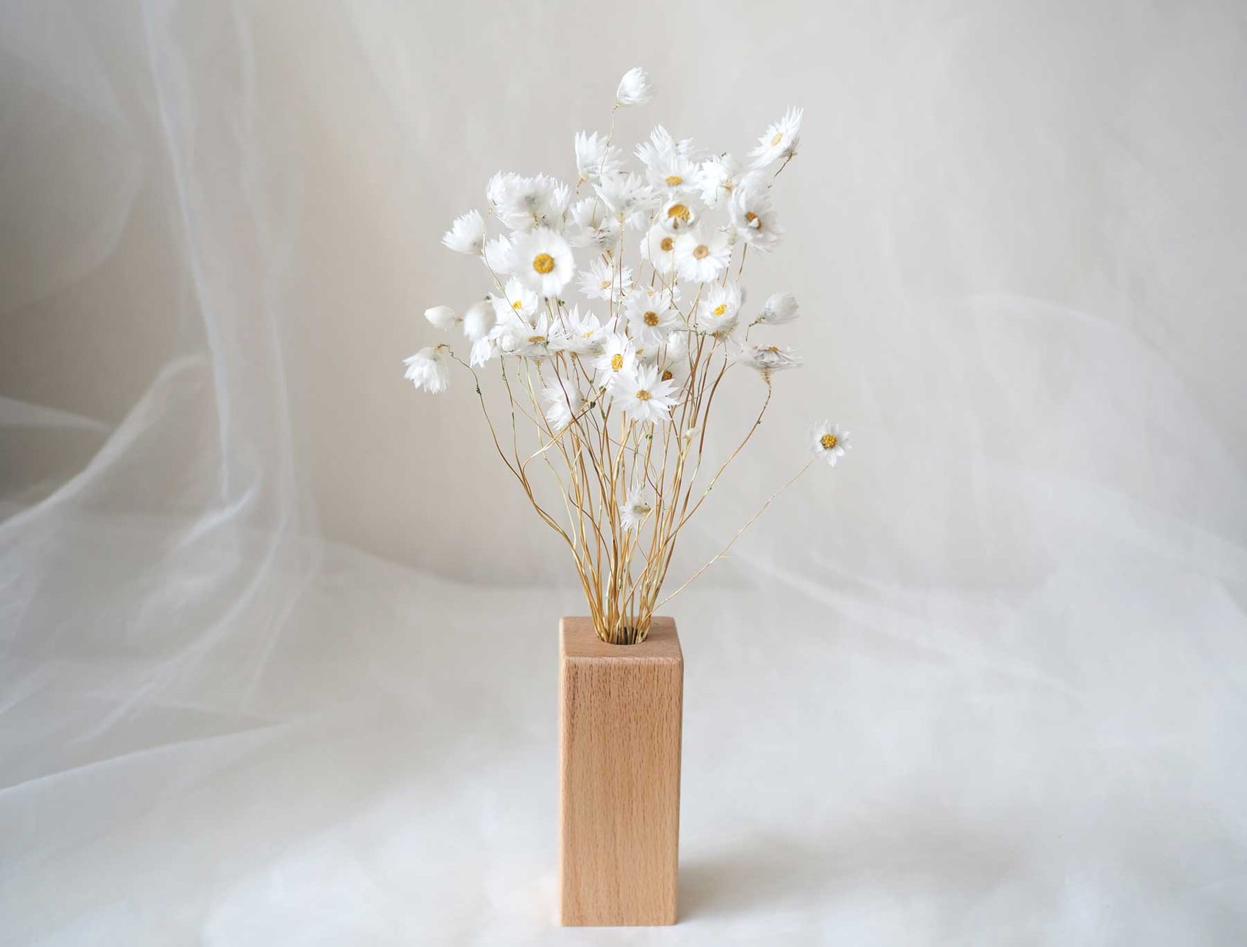 Naturally dried white paper daisies in a wooden vase, inspired by Japandi style.