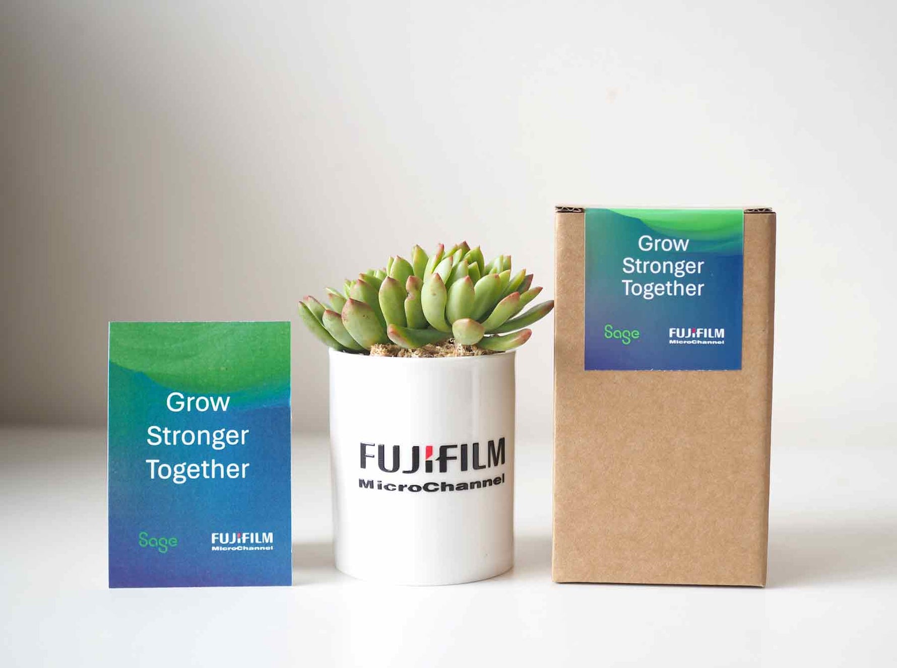 A gift box with a branded sticker, your logo and custom text.